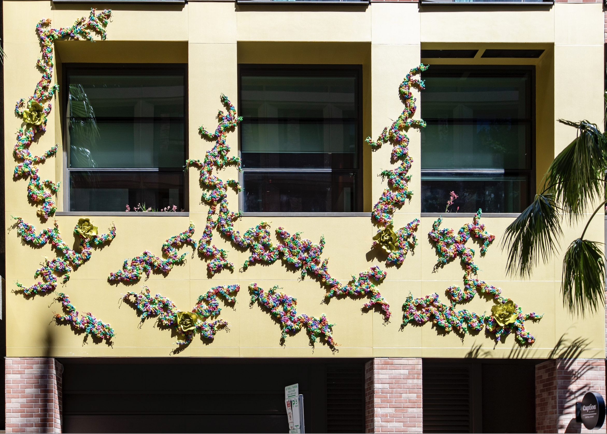 Peony Dream is an extraordinary artwork responding to the idea of a hotel and the surrounding Haymarket context. Her most ambitious public artwork to date, Tango transforms her well-known bound cloth sculptures into beautiful coloured cast aluminium forms that suggest trails of foliage and colourful blossums interspersed with large golden peonies. The original sculptural forms are cast from clothes and materials that hold memory and emotion donated to the artist from the local community. They are then transformed through her creative practice into sculptures imbued with a sense of human connection and wellbeing. Like ivy, the artwork covers a section of the hotel façade in and around windows and planters containing species relevant to Asian cultures. The artwork symbolises prosperity, loyalty, joy, courage and love. The sculptural forms sit against a a golden background reminiscent of Asian lacquer painting that acts as a framing device to bring art, plants and people in the windows together in one ‘artwork’.